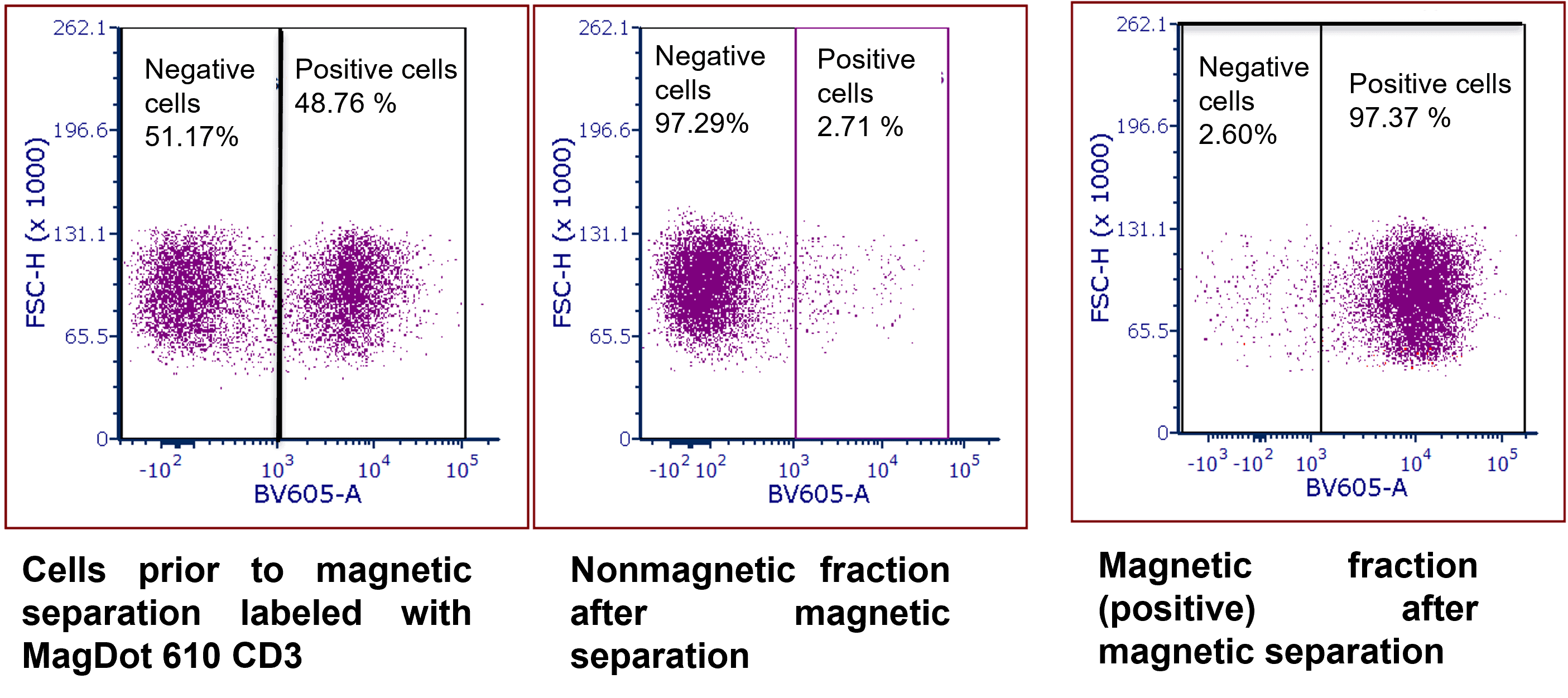 Conventional T cell isolation involves MACs followed by using a fluorophore for FACs. With MagDots 610 antihuman CD3 one can isolate CD3+ T cells in a single step. Post enrichment in a packed column magnetic system, the cell populations tagged with the MagDot can be analyzed in a flow cytometer immediately, eliminating the need for a secondary reagent.