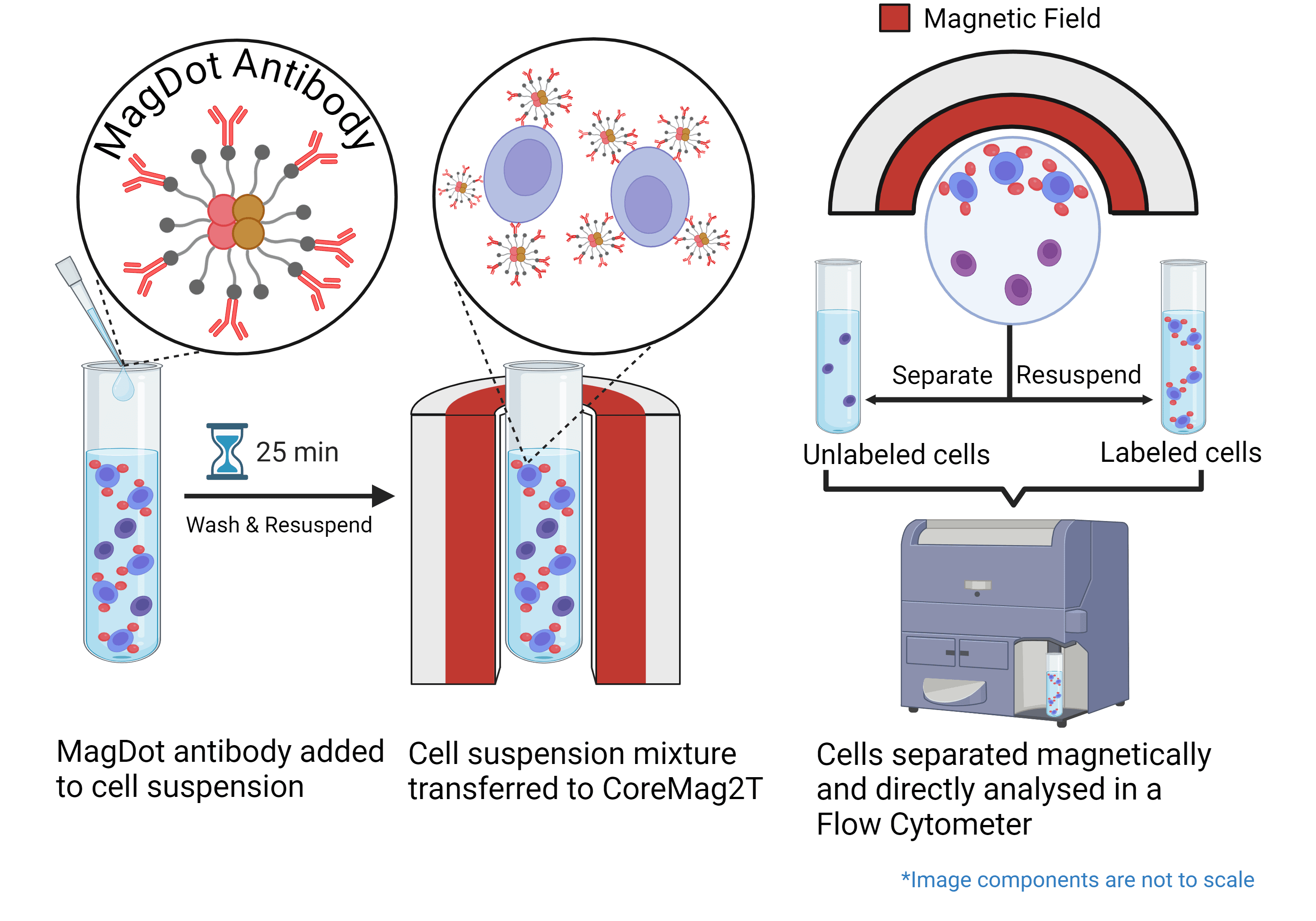 Through funding by the National Science Foundation, we developed our magnetic quantum dot nanoparticles, known as the MagDot, by encapsulating both quantum dots and SPIONs within our patented polymer coating. When MagDots are conjugated to an antibody, they bind to cells of interest. One can magnetically collect the labelled cells and immediately analyze the cells fluorescently Owing to its dual fluorescent and magnetic nature, there is no need to relabel cells fluorescently.