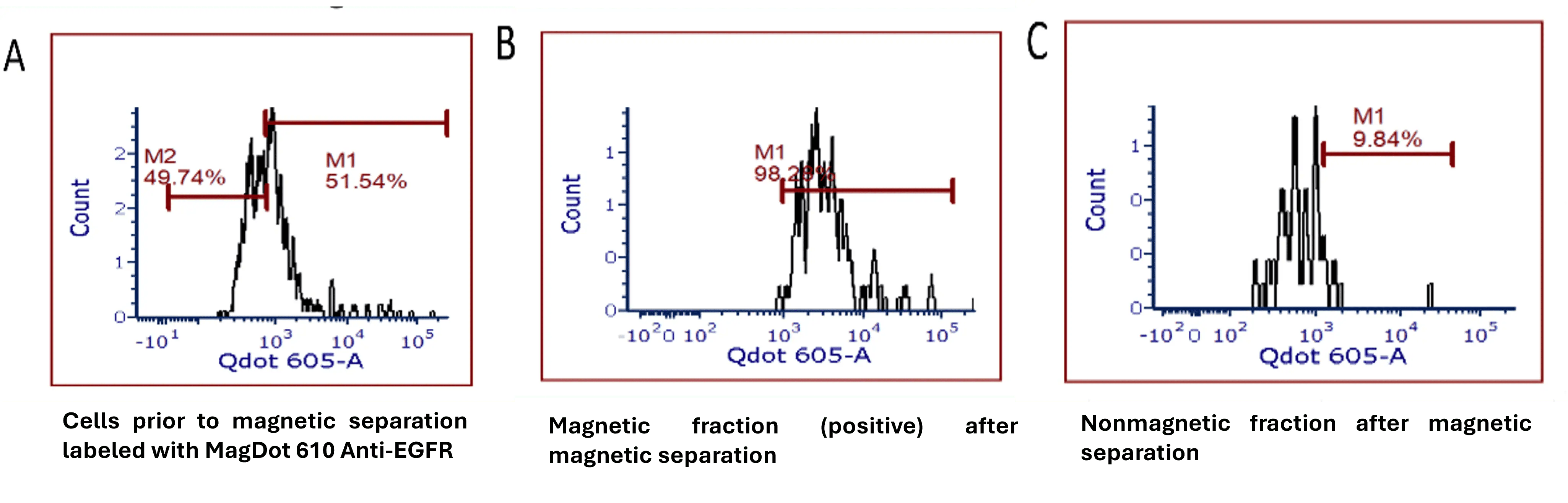 Sponsored by the NSF, MagDot conjugated to EGFR were used to enrich cancer cells from a tumor biopsy. Heterogenous tissue samples have extreme difficulty being sorted on a flow cytometer, due to increased viscosity, high contamination debris and extracellular matrix, and rarity of cells to be enriched. EGFR positive cells in a cell suspension obtained from mechanically dissociated EGFR+ breast cancer biopsy, was labelled with MagDot 610 EGFR and collected in CoreMag2T for 30 minutes. Histogram B (in the middle) show the purified population with very few positive cells remaining in the non magnetic fraction.